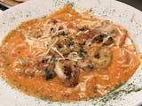 Blue crab & lobster ravioli, cooked in creamy marinara sauce, topped with grilled shrimp & tomatoes.