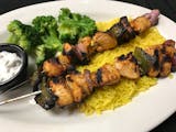 Marinated chicken skewers served over a bed of rice with cucumber sauce.